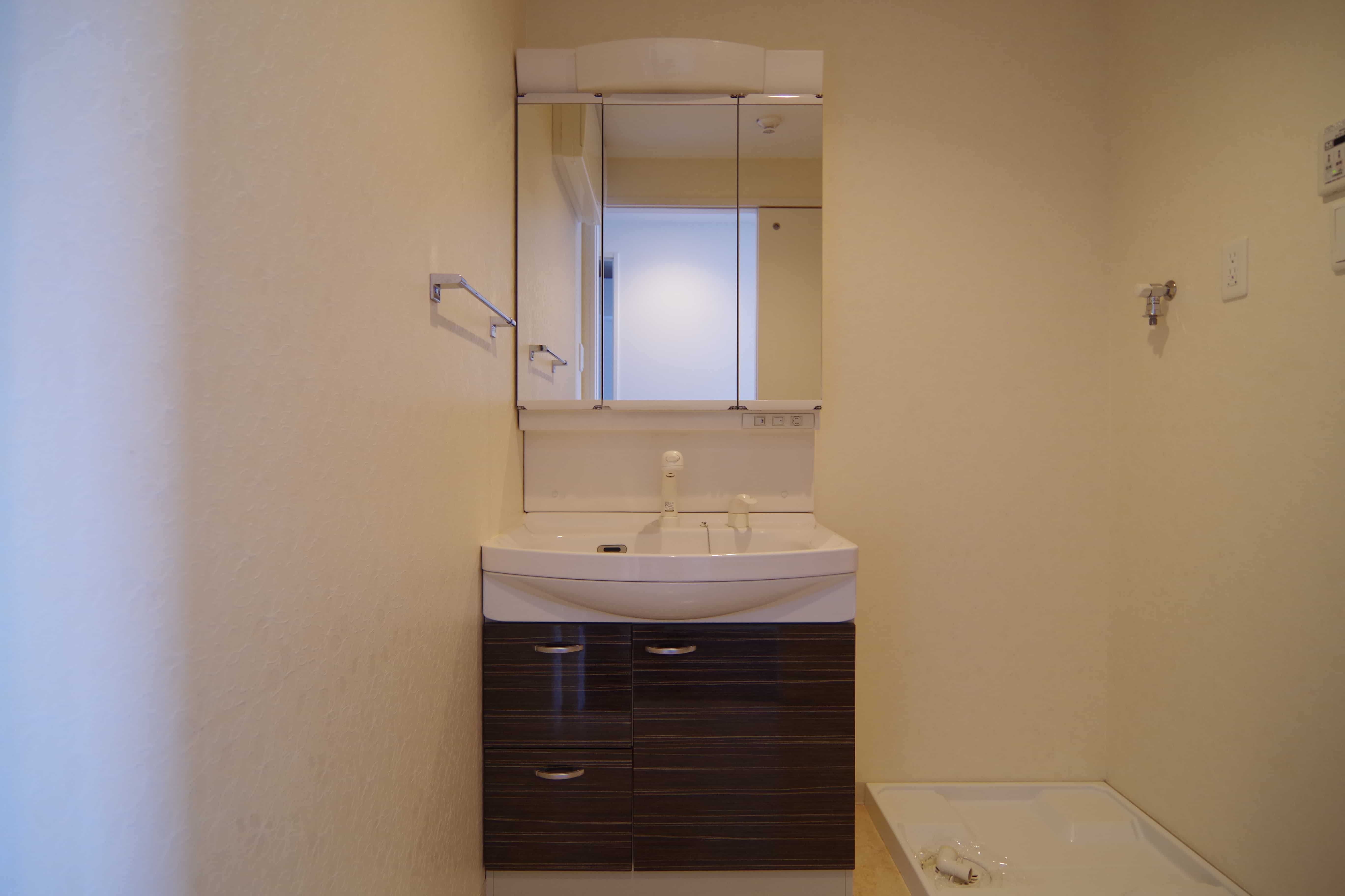 バスルームは大型サイズ(1.4m×1.6m)なので、ゆっくり足を伸ばしてくつろいでいただけます。独立洗面台は3面鏡になっており、全ての鏡の裏面が収納スペースになります。化粧品でもメンズ用スキンケア用品でも置き場所で喧嘩になることは少なくなるかも?トイレはもちろんウォッシュレット+温熱便座です。